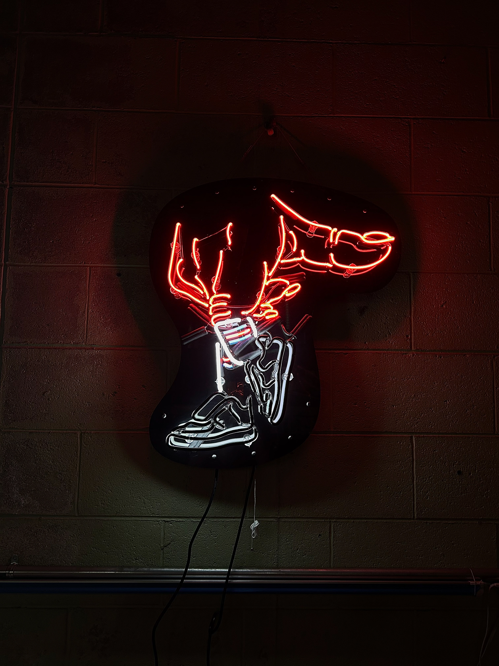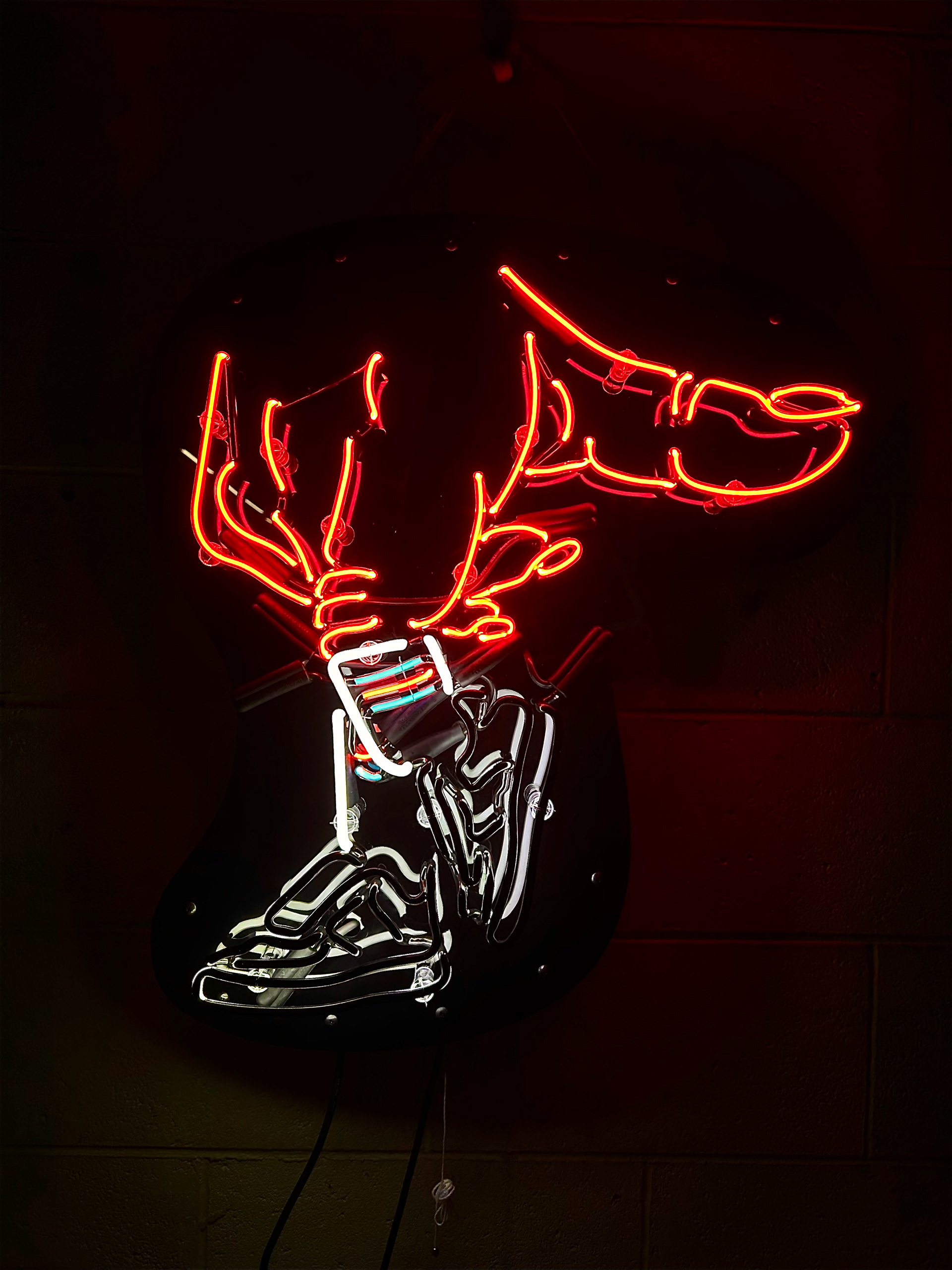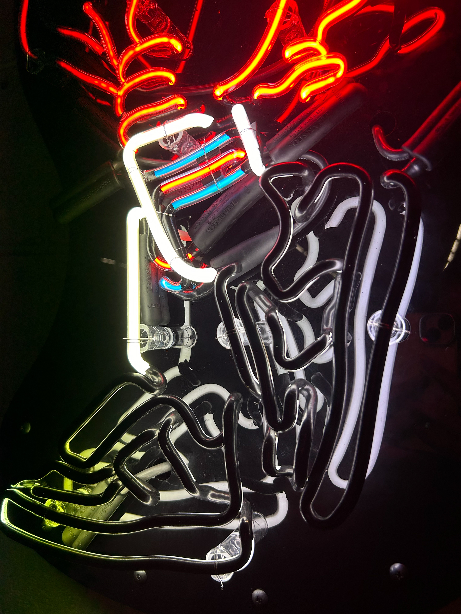 8mm Clear Glass filled with Neon and Argon with Mercury, 8mm Snow White Glass filled with Argon and Mercury. Mounted on Reflective Black Acrylic.